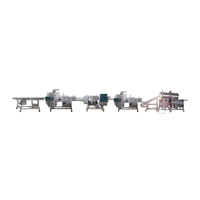 雞腿生產(chǎn)線把混合好的雞腿或者雞翅經(jīng)上粉,上稠漿,上粉,滾筒上粉,油炸,速凍等工藝做出裹粉的炸雞腿。雞腿生產(chǎn)線的需要配置前處理設(shè)備和后處理設(shè)備:油炸,包裝等設(shè)備,雞腿生產(chǎn)線與這些配套設(shè)備組成一條完整的快餐調(diào)理生產(chǎn)線。