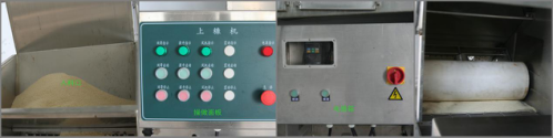 上面包屑機(jī)是通過料斗里泄出來的面包屑和網(wǎng)帶床身上的面包屑將面包糠均勻涂裹在產(chǎn)品上;再經(jīng)過壓輥時,面包屑被壓附在產(chǎn)品上;經(jīng)過風(fēng)刀時,多余的粉被吹落;最后將產(chǎn)品輸送到下一工序。